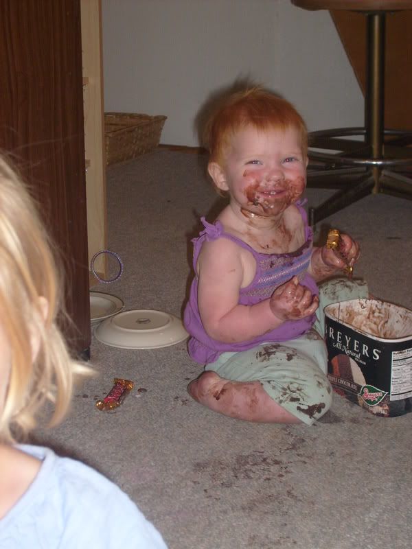She's using a Twix bar as a spoon. Because I'm a responsible parent. A kid can never have too much sugar - if you don't think they're getting enough, give them sugar to use as a utensil.