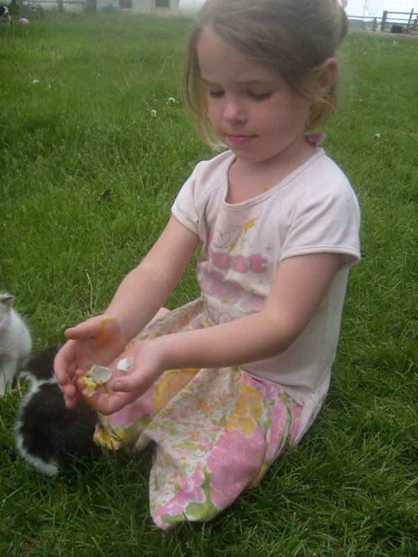 "Hannah, look what I found! It's a swallow's egg, I think. The shell is so thin, I can't believe it fell all the way to the ground without breaking! Yeah, you can hold it. I want to get a picture of it. Just don't squeeze .... well, hold still, I'll take *that* picture. Let's go wash you off."
